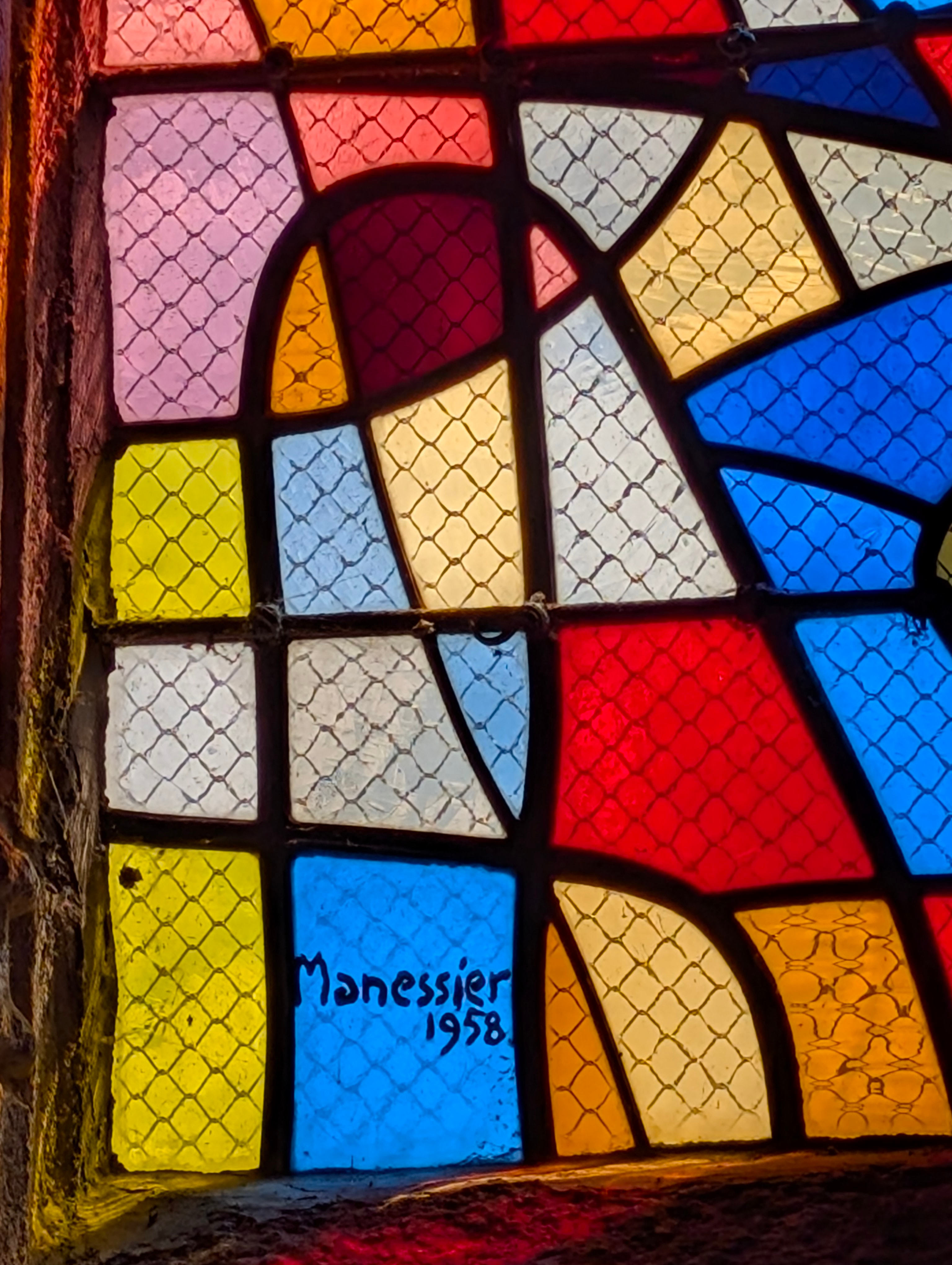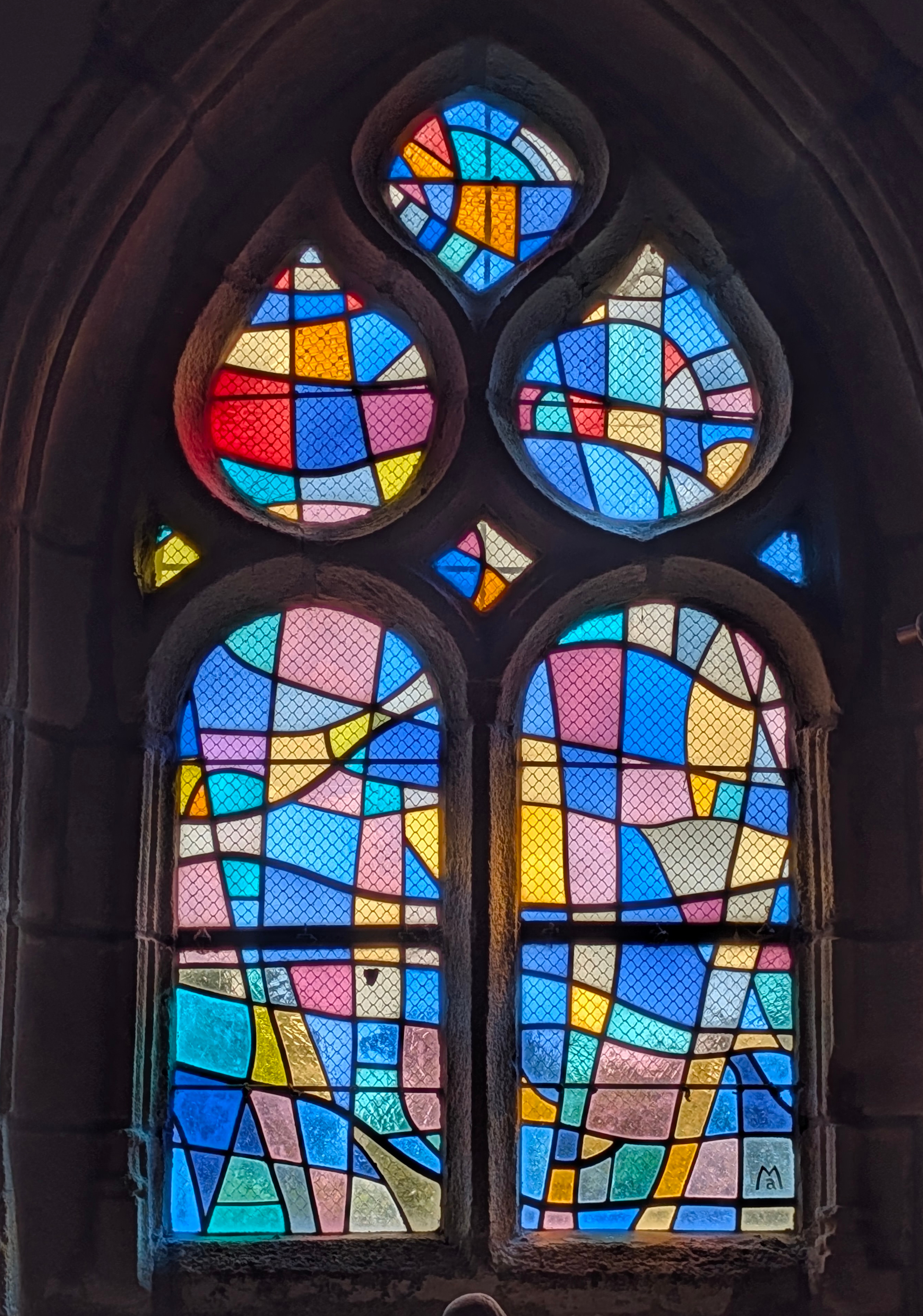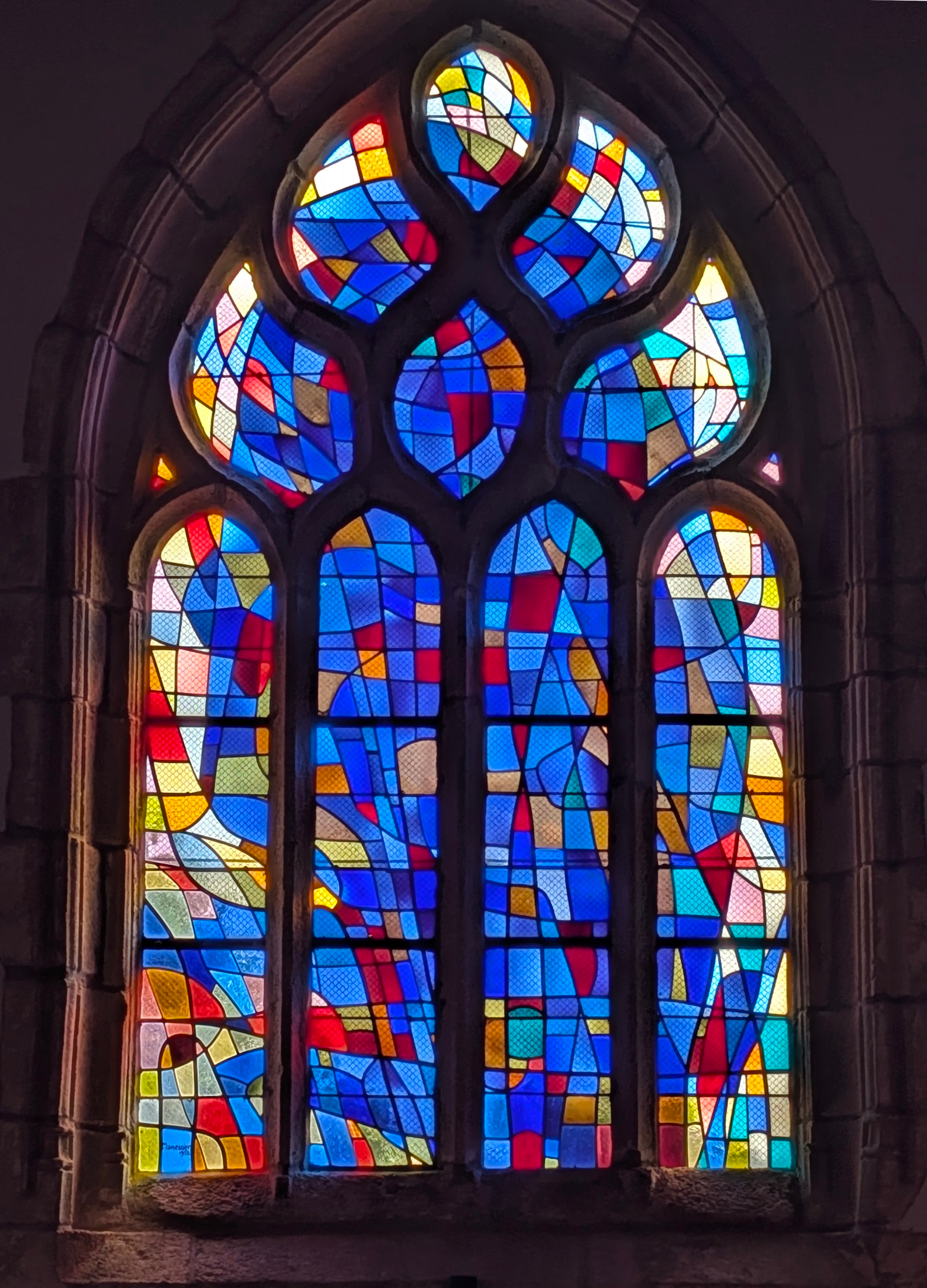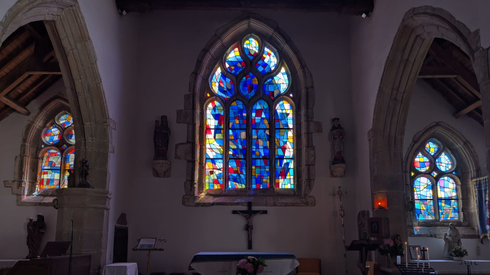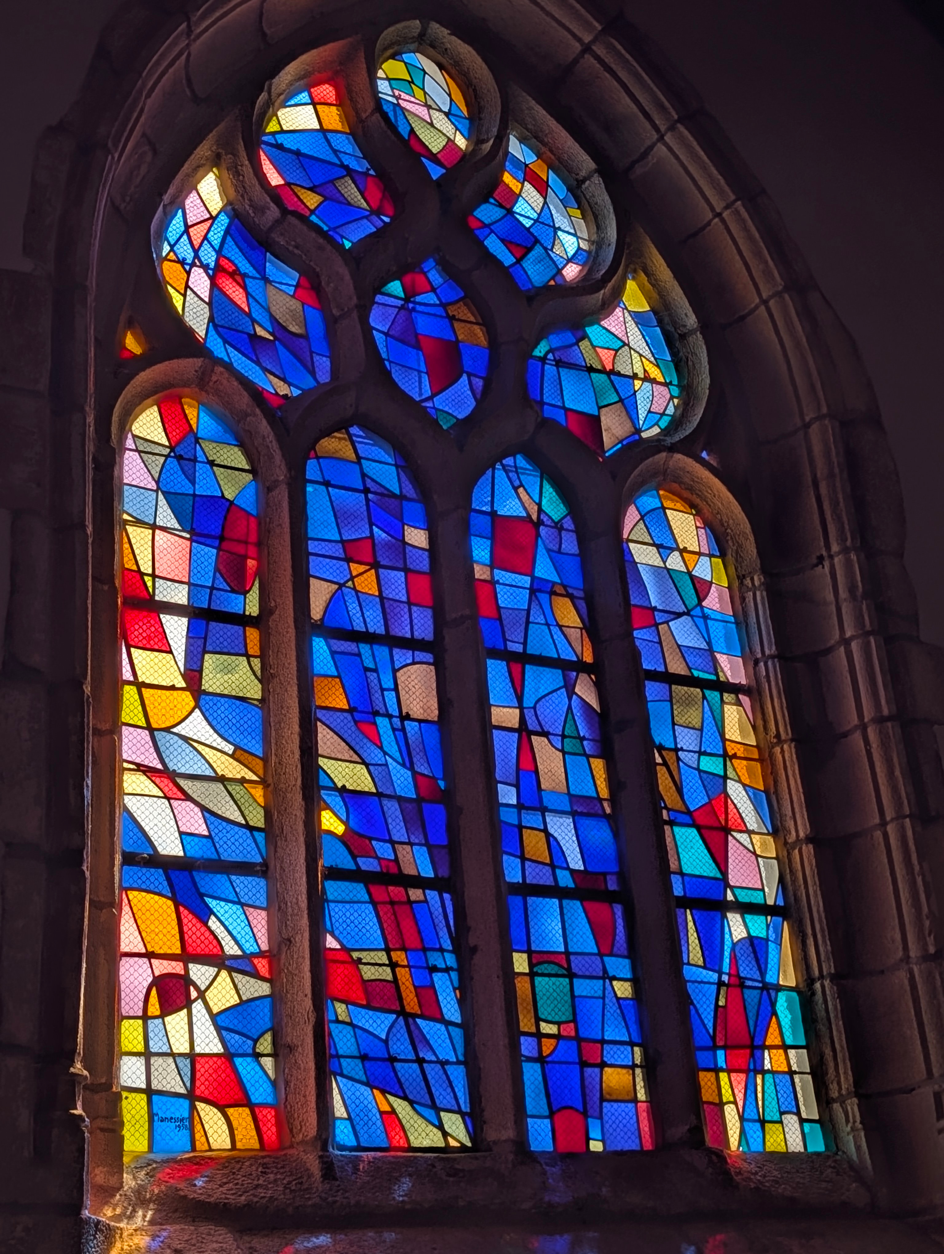| Emplacement : Trois vitraux pour le chœur (vitrail central : Le Voile de la Vierge) signés Alfred Manessier. |