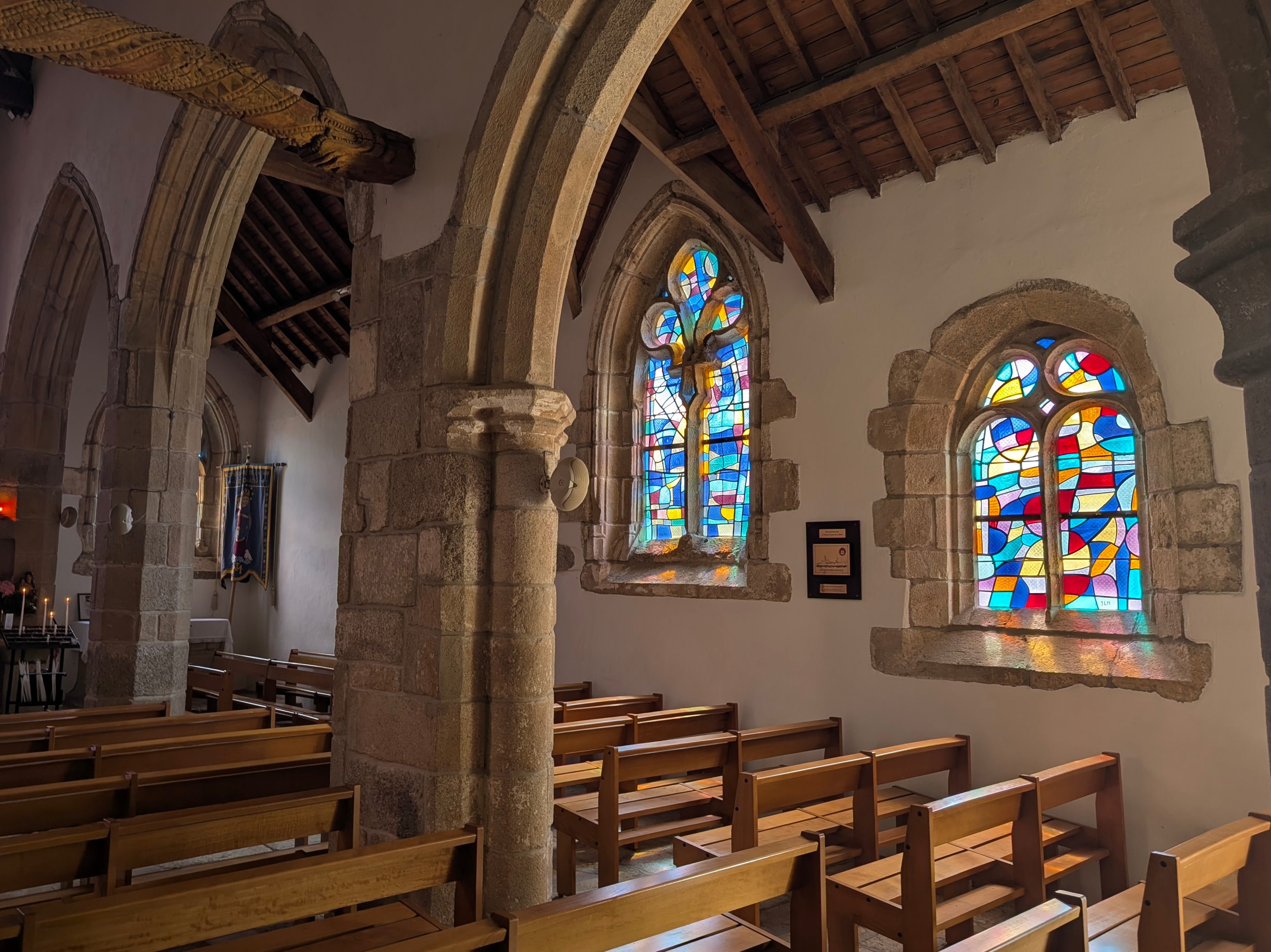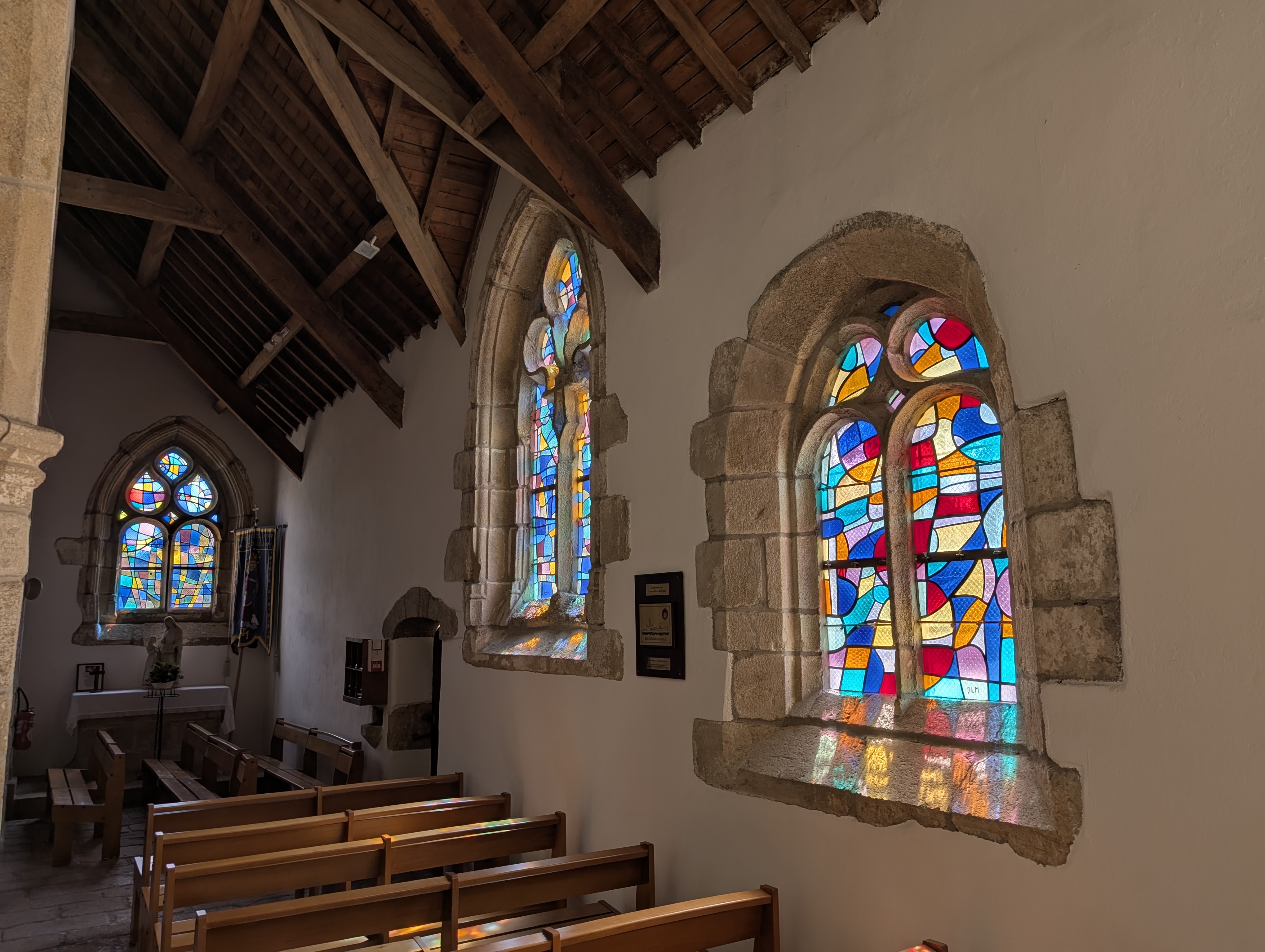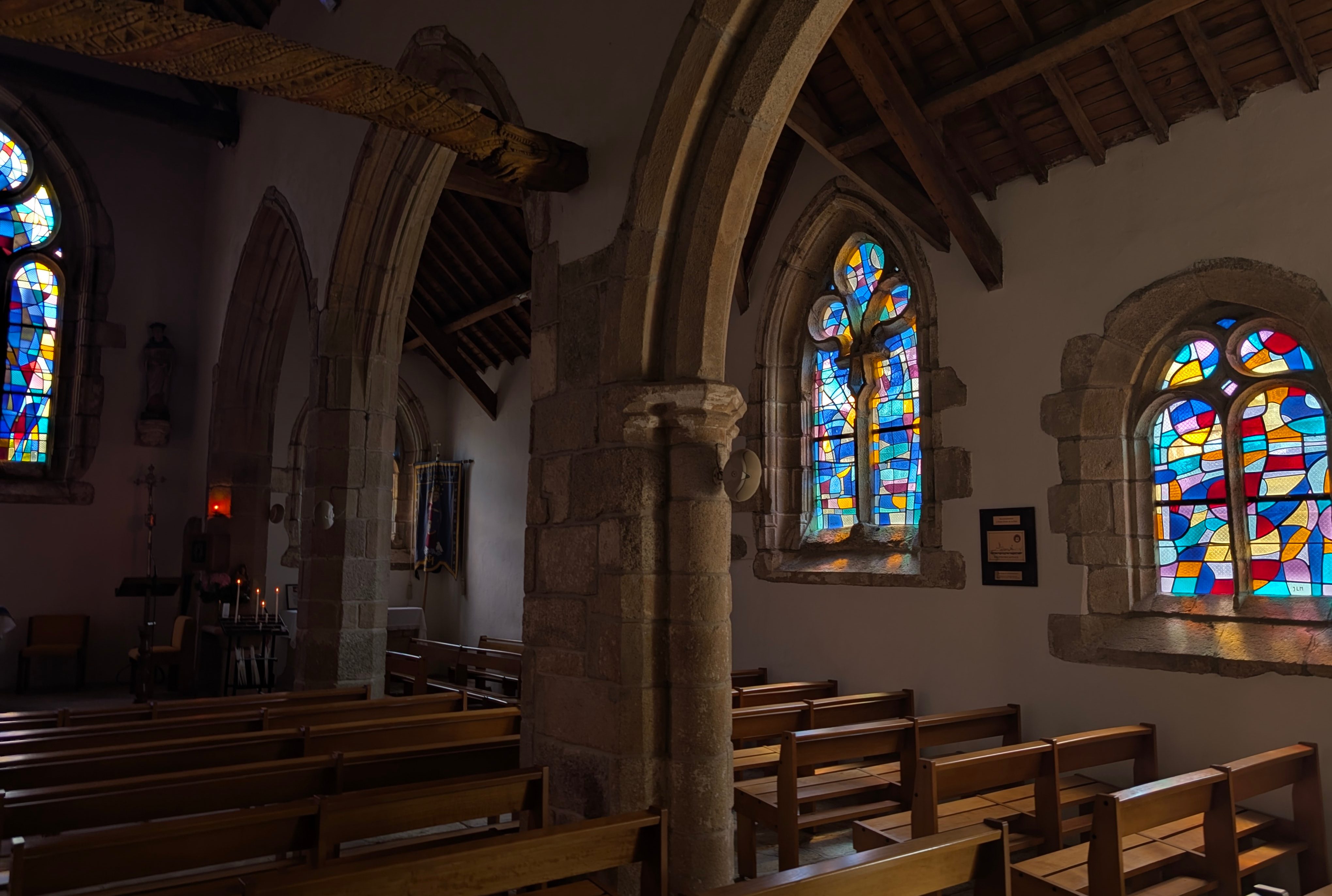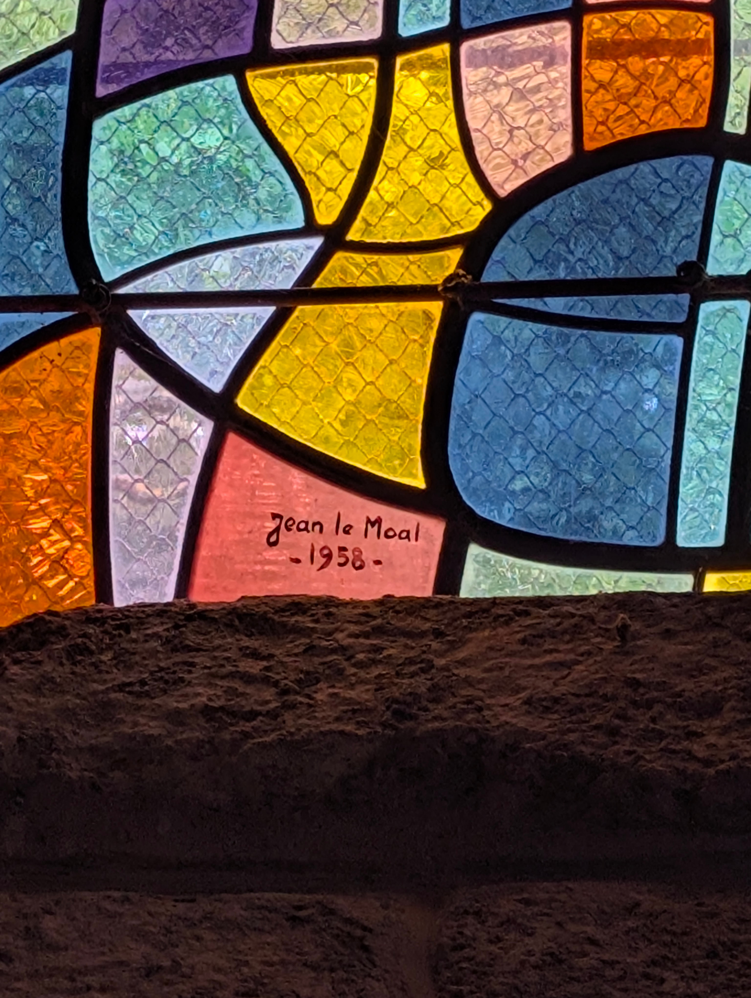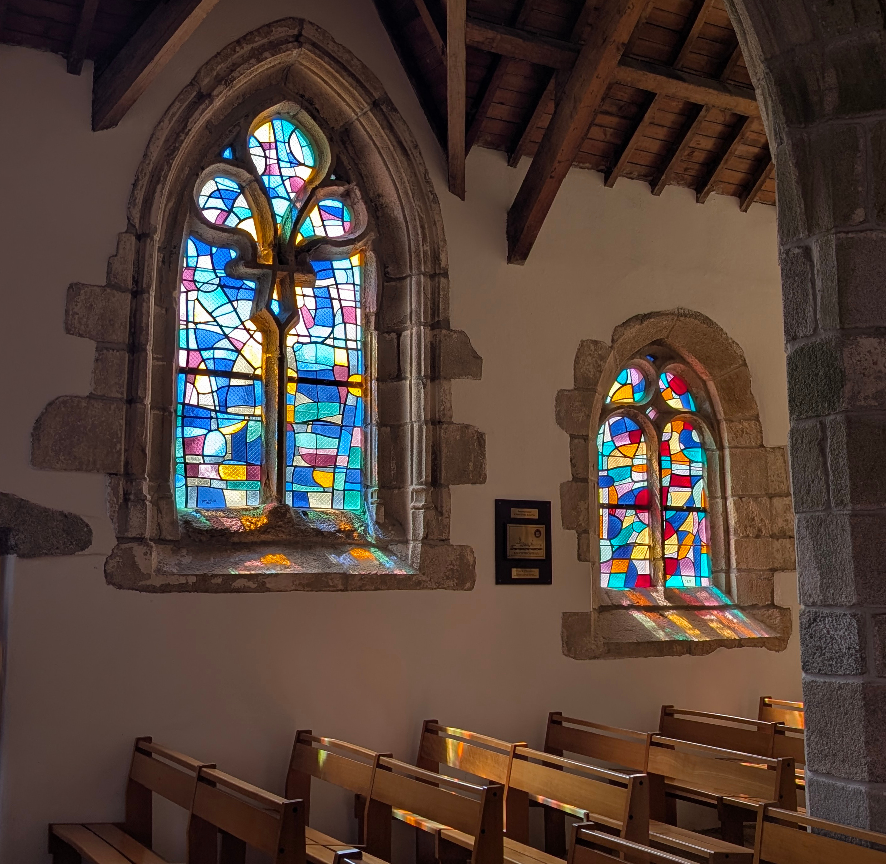 Les vitraux ont été réalisés par l'atelier Jean Barillet à Paris et la pose a été réalisée par les ateliers Le Bihan-Saluden de Quimper. |